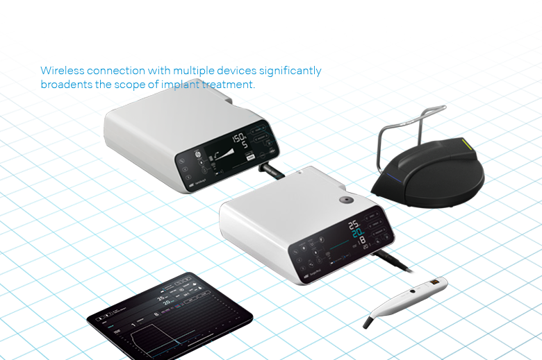 • The Osseointegration Monitoring Device, "Osseo 100+" measures the implant stability quotient contactlessly and can be connected using Bluetooth®, permitting ISQ confirmation over a shared interface. You can share and manage the data of those measured ISQ scores on other terminals through Surgic Pro2.
